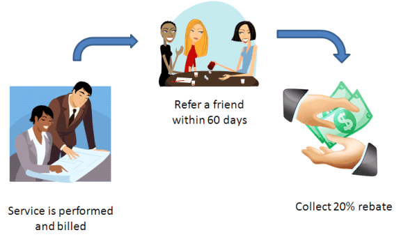 For example, if your bill is $500 and you refer 3 customers where their bill is $600 each, you will receive a 60% rebate. That is $300 dollars in your pocket.